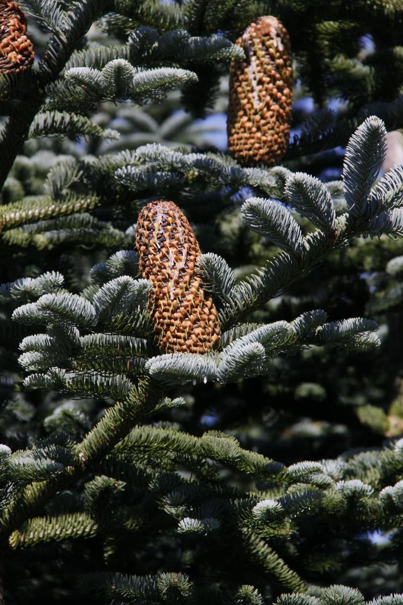 In the deep forests, Noble Fir is a magnificent, majestic and symmetrically formed “tree fir” having a straight clear trunk frequently for 100 feet or more. It towers to a height of from 150 to 200 or more feet, and has a trunk diameter of two to five feet. Trees 250 feet tall and more than six feet in diameter have been found. The branches are short, rigid, and stand out almost at right angles to the trunk except for the lower limbs which have a tendency to droop somewhat. The well-formed crown is rounded and narrow. The needles, growing thick on the twig and curving upward, are a pale to dark bluish-green with a silvery tinge, are one-half to one inch long, grooved on the upper surface and usually