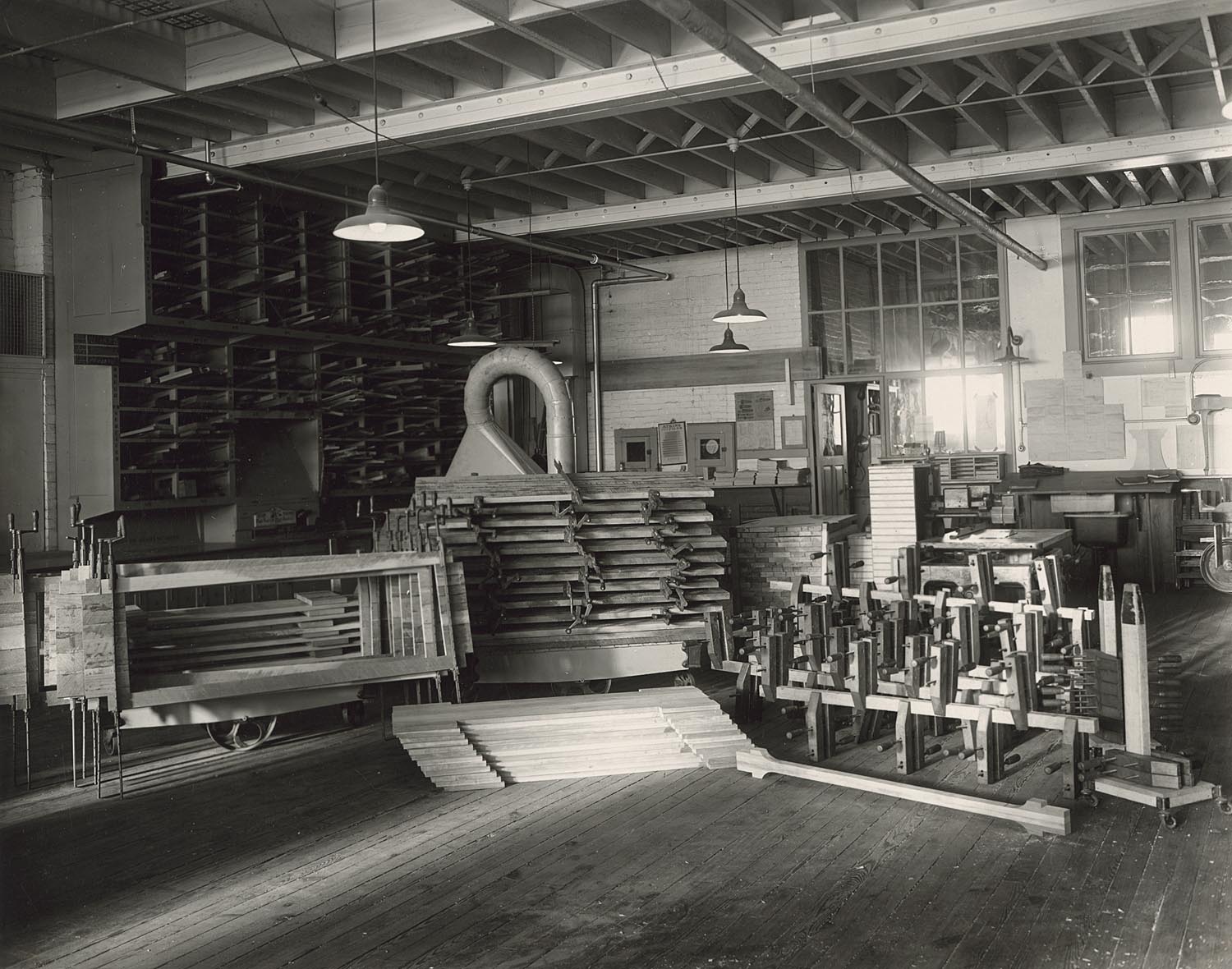 Classroom view of the rough wood stock that was built up by gluing edge to edge or side to side, preparatory to squaring for tops, ends, stretchers, etc. (1920)