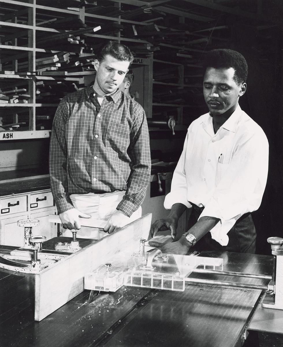 Sudanese Student In Woodworking Class University of Wisconsin Woodworking Program with Sudanese student at table saw. Image date 1962