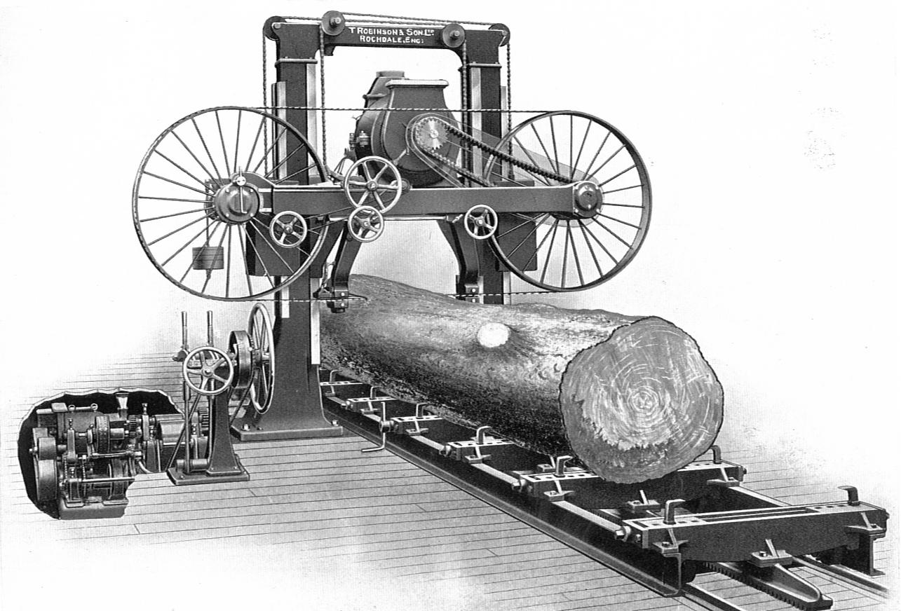 Horizontal Log Band Mill (Carpentry And Joinery,1925) Horizontal Log Band Mill made by Robinson & Co. of Rochdale, England.