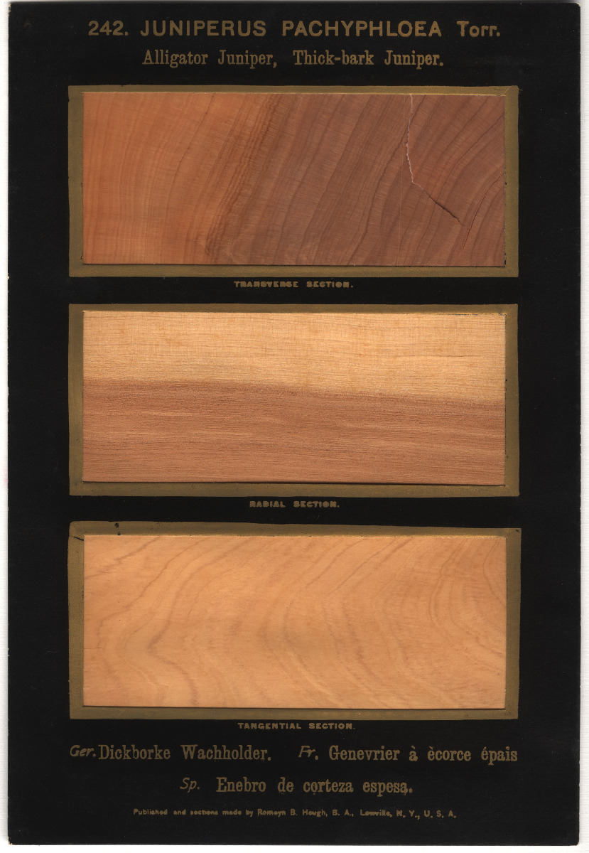 427 | 242. Juniperus Pachyphloea Torr. Plate No. 242 Juniperus Pachyphloea (Torrey) cross section plate. Reference: An Index to “The American Woods” by Romeyn B. Hough. https://www.lib.ncsu.edu/specialcollections/forestry/hough/toc.html. Accessed 17 Feb. 2019. |