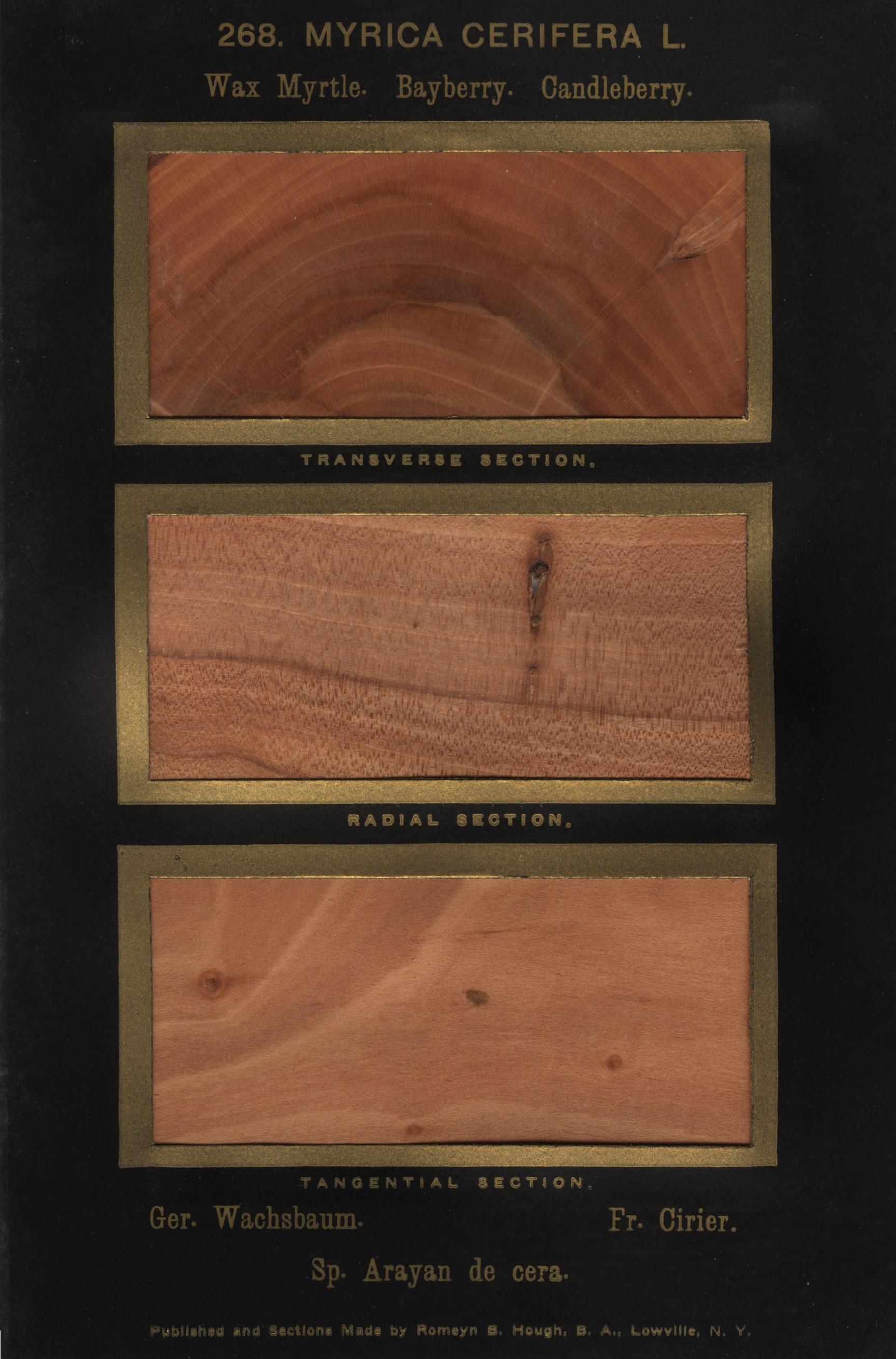 | 543 | 268. Myrica Cerifera L Romeyn B. Hough's American Woods, Volume XI plate 268 Reference: Plate_268.Jpg (JPEG Image, 1852 × 2711 Pixels) - Scaled (33%). https://www.lib.ncsu.edu/specialcollections/forestry/hough/vlgimage/plate_268.jpg. Accessed 18 Jan. 2020. |